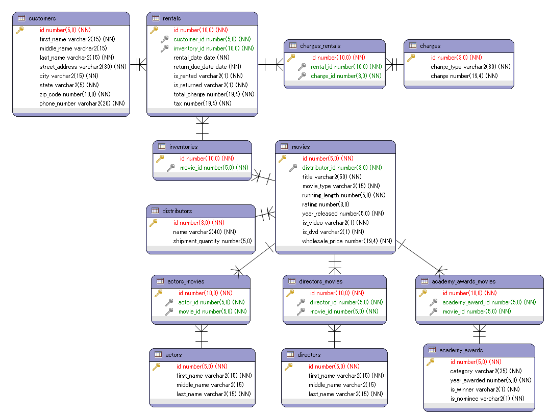 There must be no limit to the number of video and/or DVD copies of a movie that Mom and Pop can have in their inventory. Video/DVD ID numbers, movie ID numbers, and distributor ID numbers for videos, DVDs, and movies are all different. Also, each movie must be able to have an unlimited number of actors, actresses, directors, and academy awards (i.e., Oscars). Other types of awards (e.g., Golden Globe, People's Choice, etc.) are not of interest for this application. The rental of equipment, sale of videos, DVDs, popcorn, etc., is not to be kept in the database.