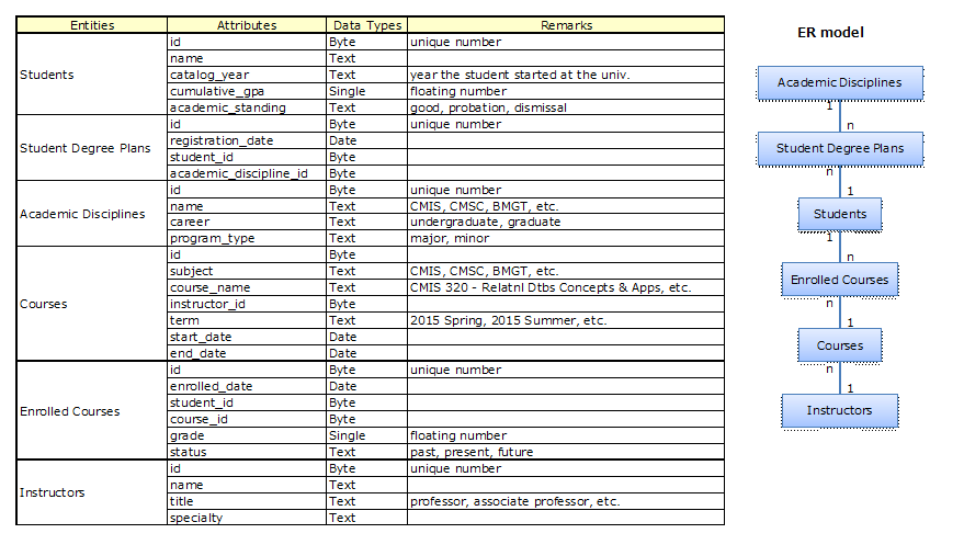 You have been tasked to create a database for your college to track students, their courses (past, present, and future), grades and academic standing, and instructors.